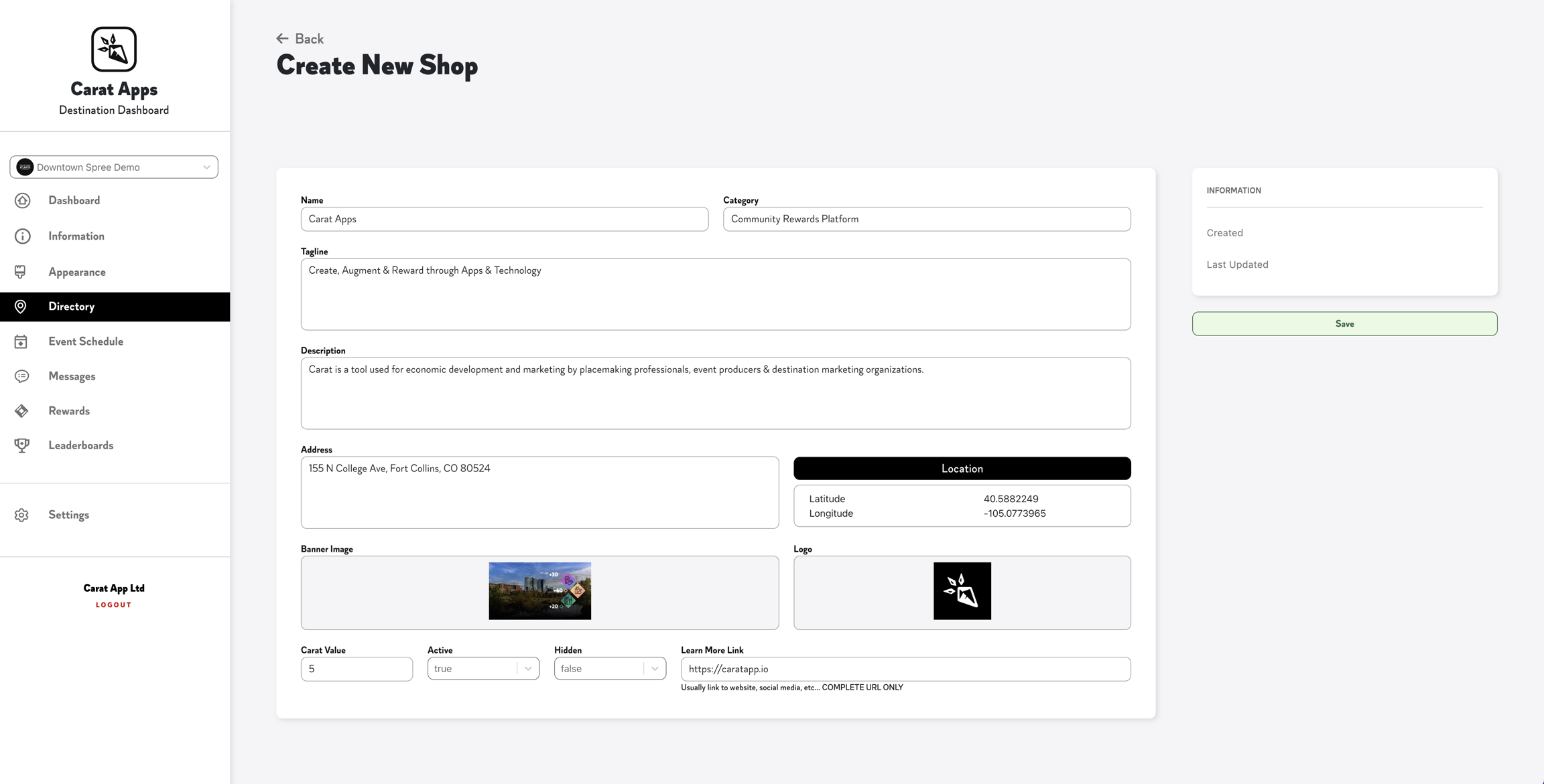 From the Directory, Shops can be filtered by Name (A-Z), Category (A-Z), Value (Carats Earned from Check-In), Active (True / False) & Hidden (True / False).