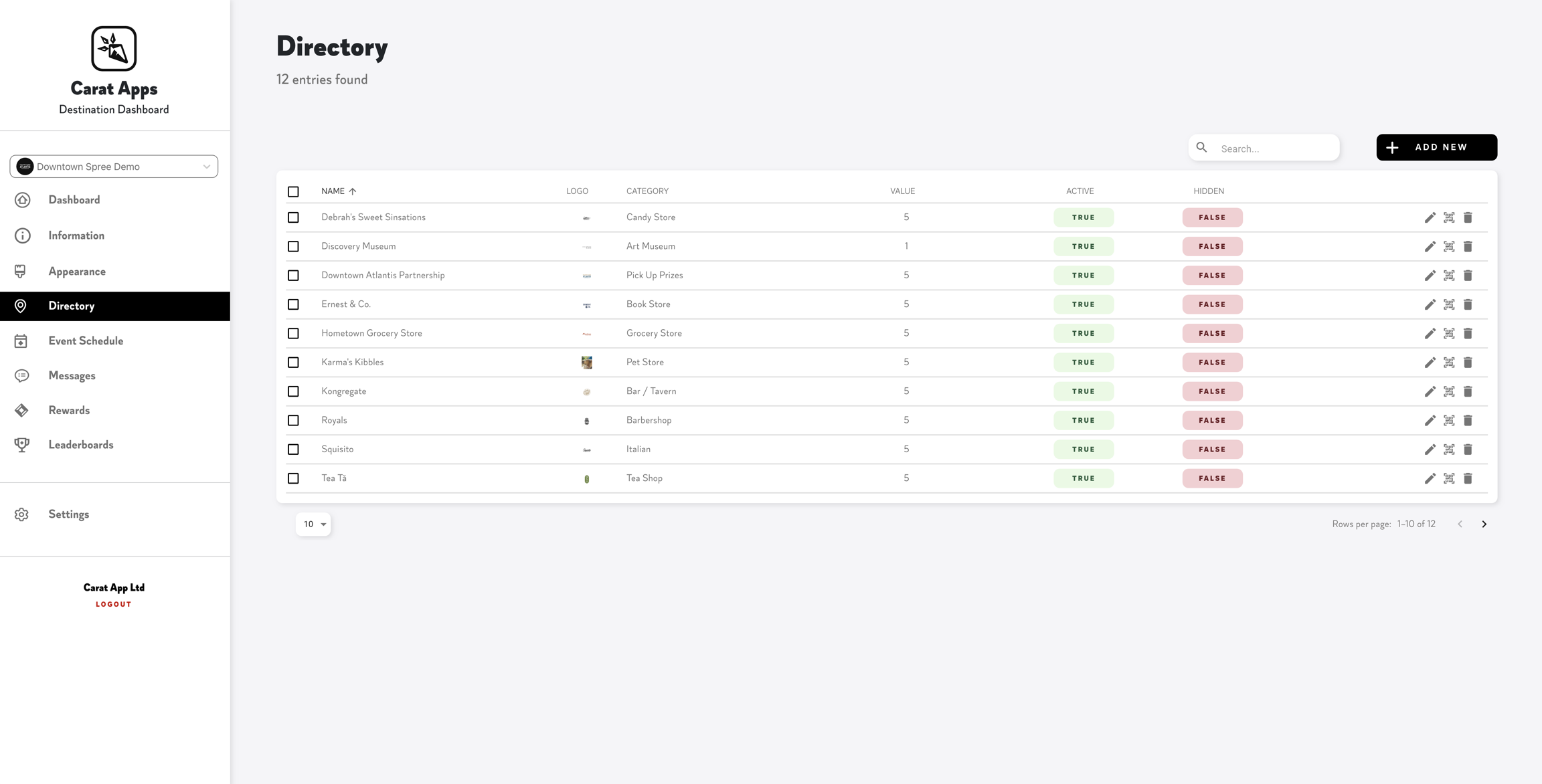 To access this page, click Directory from the menu options. From here, you will see a list of all Directory listings (Shops) available within your Carat Event.