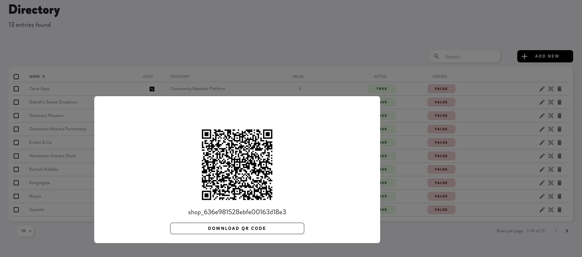 On each Directory Listing, the three icons from left to right are Edit, QR Code & Delete.